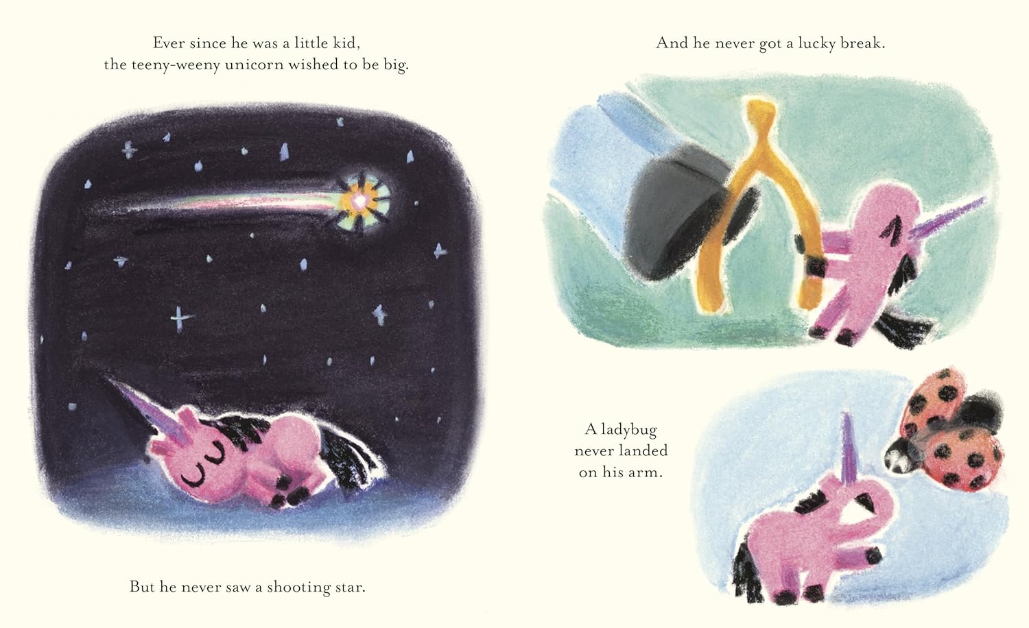 Once upon a time, there was a teeny-weeny unicorn that wished to be big. But he never saw a shooting star, and a ladybug never landed on his arm. So when he comes across a dandelion poof, he decides to give his wish one last try. With a little help from a gust of lucky wind and a clever princess, the Teeny-Weeny Unicorn sets off on a quest to find something littler than he is.