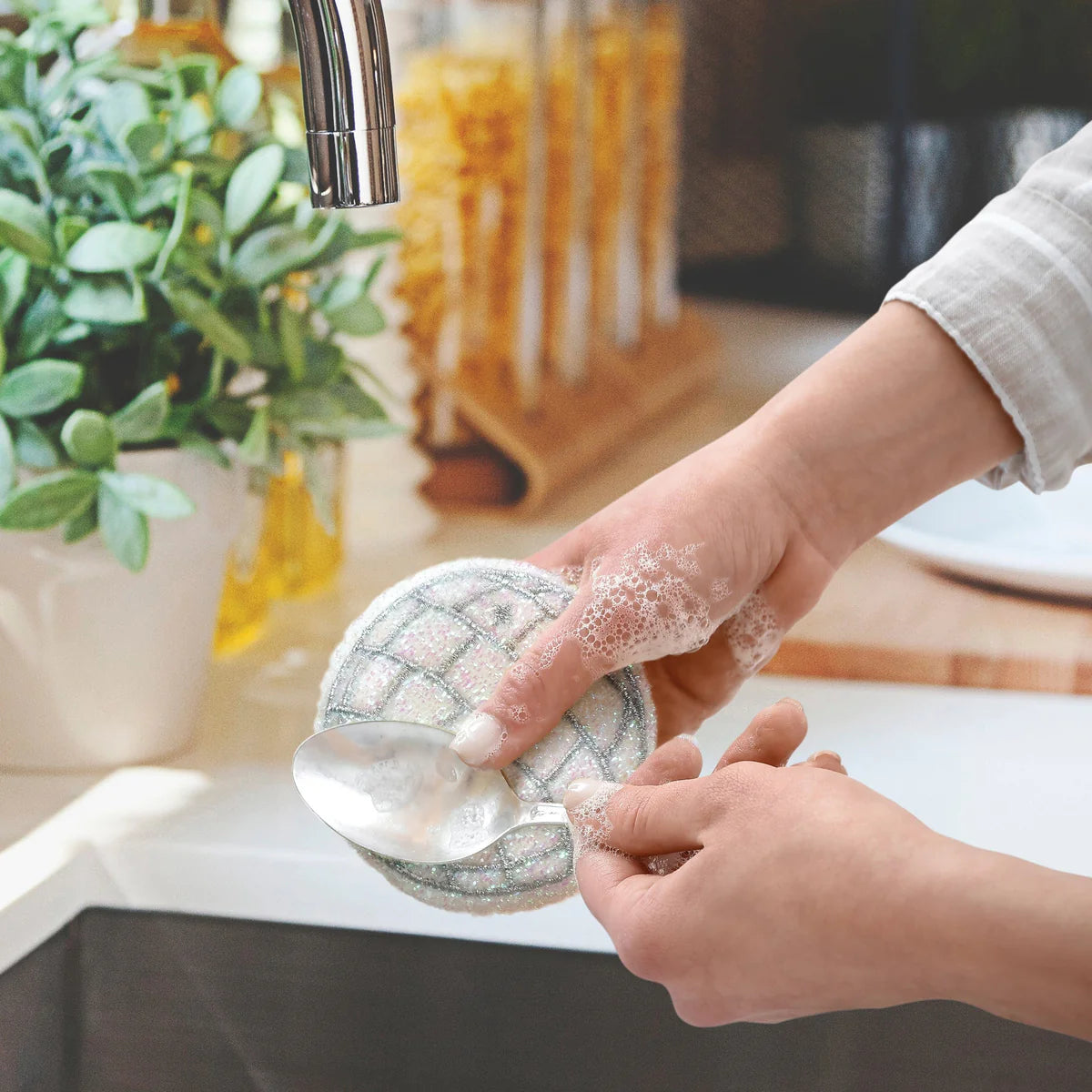 Next time your dishes get funky, reach for Fred’s Dishco Fever sponges and get down – and tidy! These sparkly, scouring sponges will have your kitchen shining brighter than a mirror ball on the dance floor. Hang them over your faucet by corded loops to dry (and display). Set of two sponges, packed on a backer card with iridescent details.