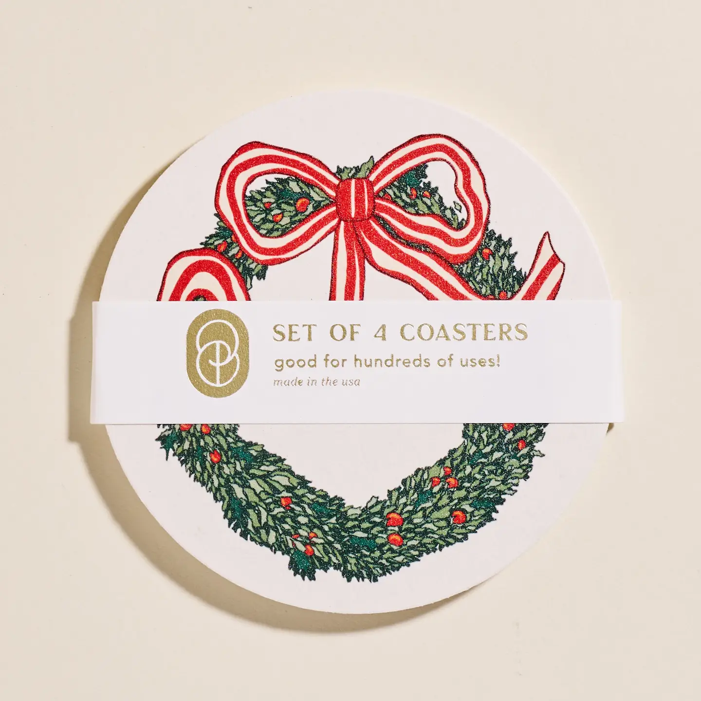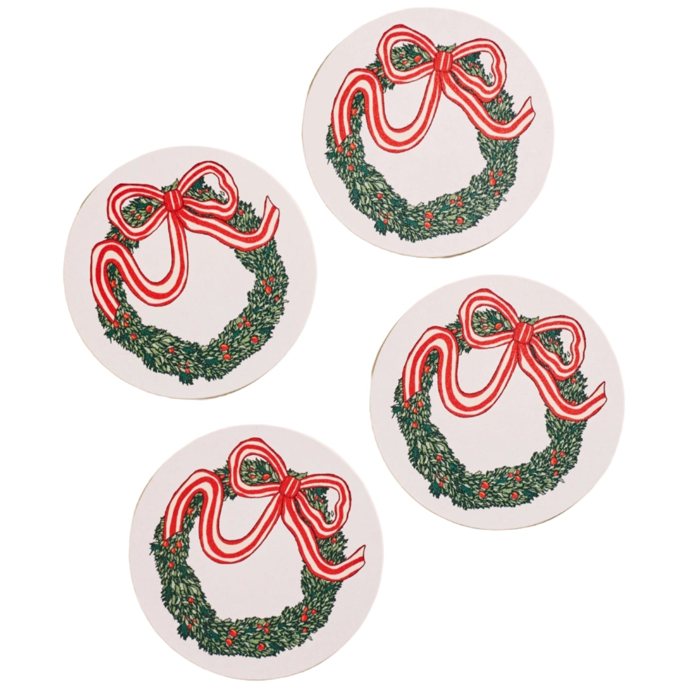 Get festive with these coasters showcasing a holiday wreath topped with a big red bow, perfect for Christmas parties or seasonal gatherings. Reusable and absorbent, these coasters will last you for months, and look stylish while soaking up any drips. Set of four chipboard coasters, measuring 3.7 inches.