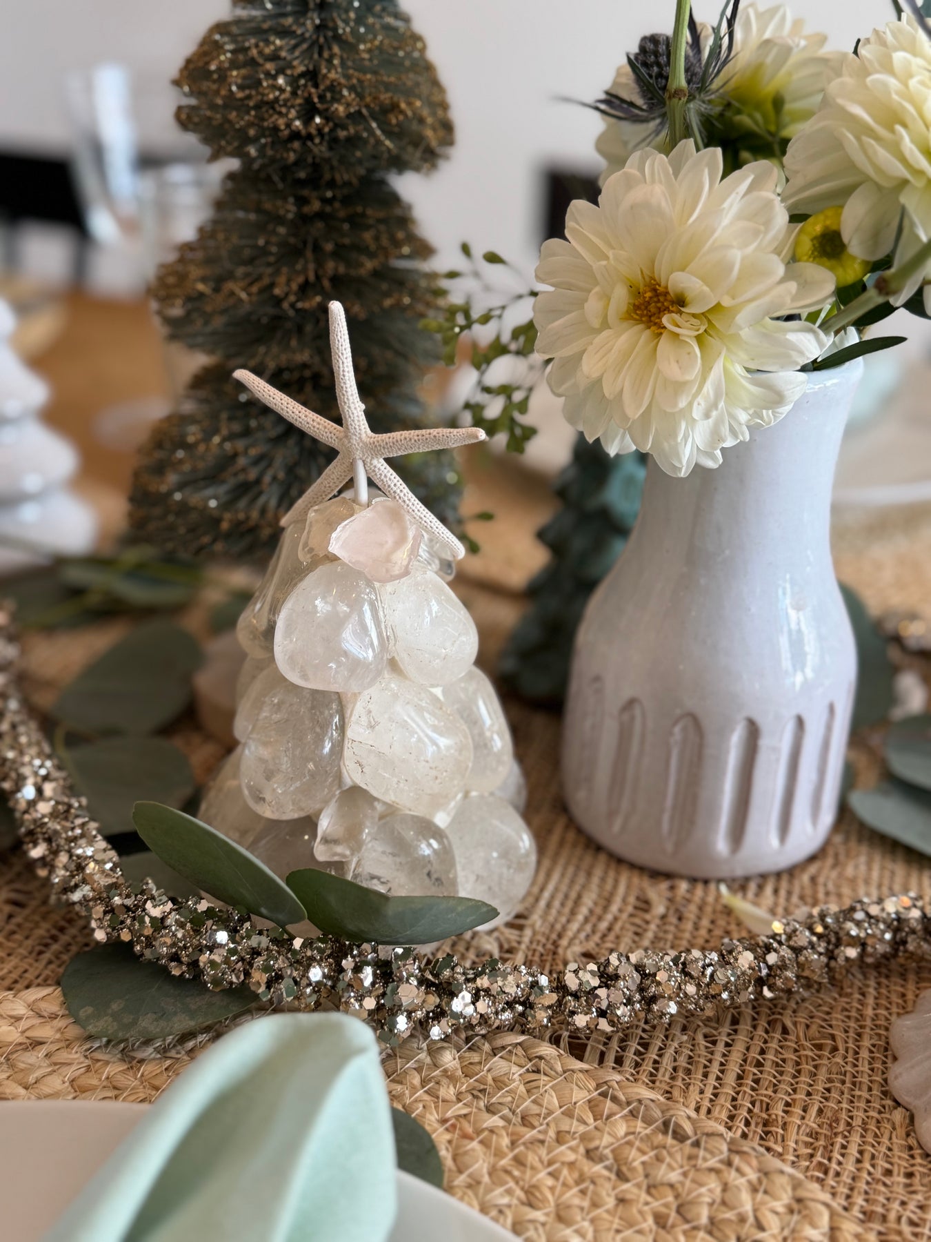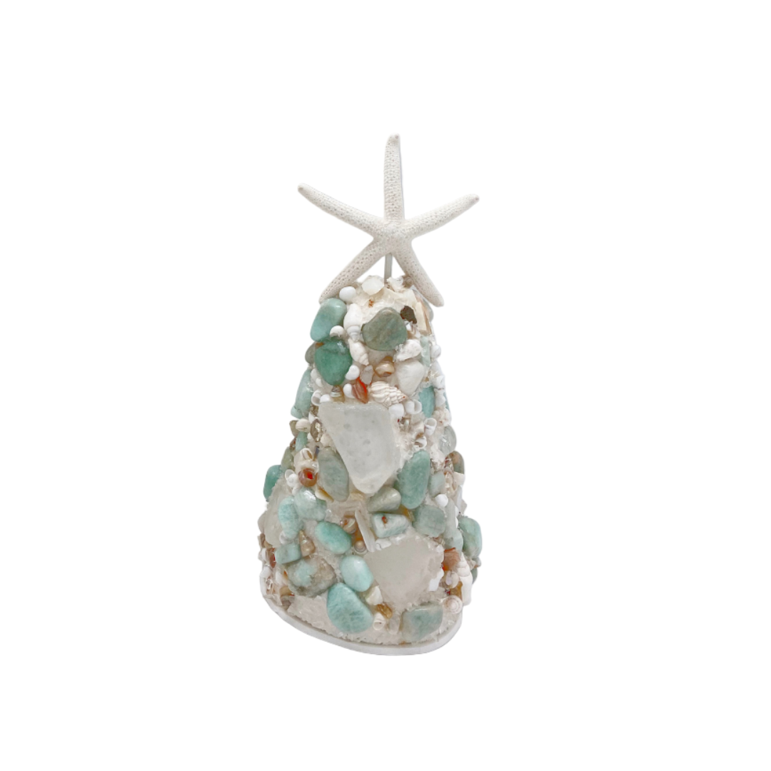 Amazonite, clear quartz crystals, white seaglass, seashells and mother of pearl pieces placed just so.