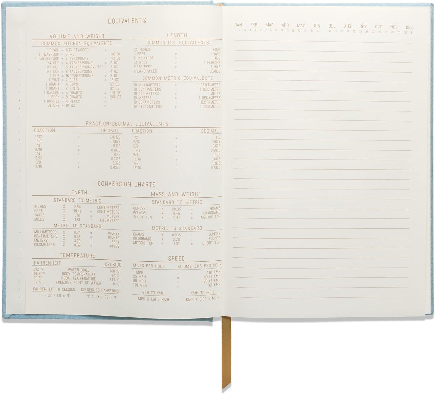 The interior features 160 lined pages with day and month headers, plus handy extras like a world map, multiplication table, and holiday overview. A lay-flat sewn binding allows the notebook to open wide for comfortable writing, while a ribbon marker and interior pocket make it easy to stay organized.